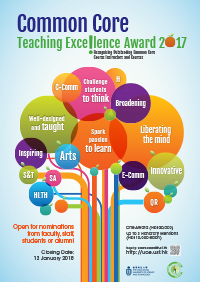 We are pleased to announce that the Common Core Teaching Excellence Award 2017 is now open for nomination. Any instructor or team of instructors who has designed and/or taught a common core course between 1 January and 31 December 2017 may be nominated for the Award.
